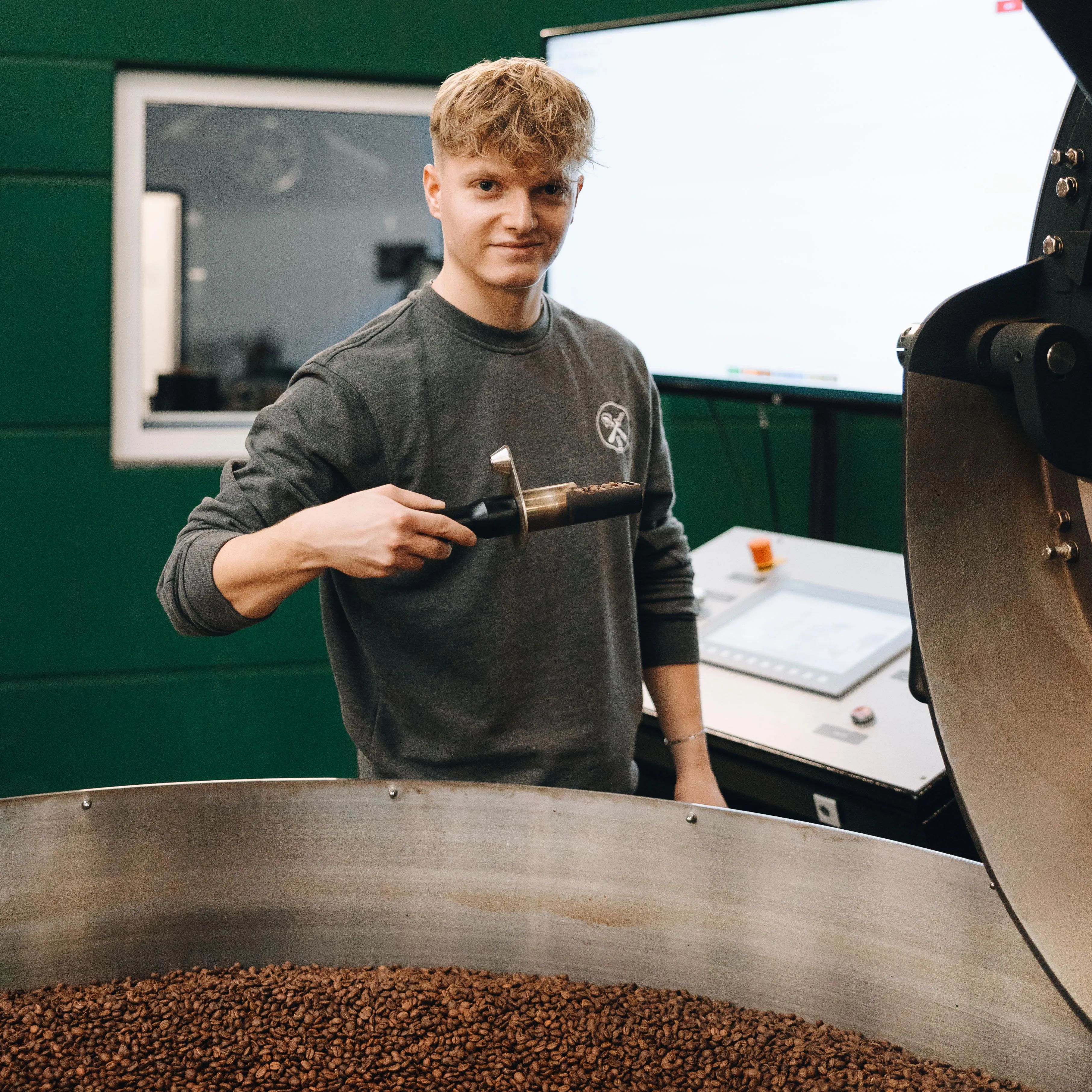 Diese Werte spiegeln sich auch in unserem Logo wider: Ein Zunftzeichen, das die Werkzeuge unseres Handwerks vereint – die Trommel, das Feuer, den Probenzieher und den Siebträger. Symbole für das, was unseren Kaffee ausmacht: Zeit. Handwerk. Und Liebe zum Detail.